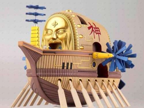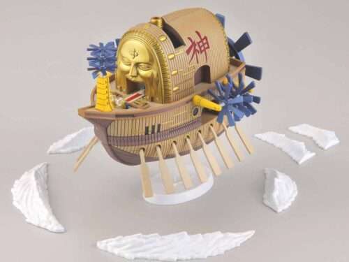 The ARK maxim, God Enel’s ship that appears in the 30th volume of One Piece, is now available in the grand ship collection series! New display parts have been added to recreate the flying ship and White cloud effects to mimic the maxim drifting through the clouds are also included. Propellers on the sides of the ship can rotate individually, making this the first ever grand ship collection model kit able to simulate flight! Set includes cloud effects x1 and display base for flight model. Runner x4. Foil sticker sheet x1. Marking sticker sheet x1. Instruction manual x1